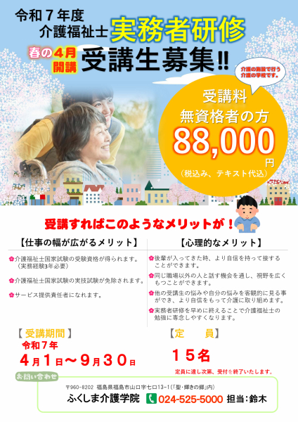 ふくしま介護学院 【ふくしま校】 ☎024-525-5000 担当:鈴木 【しらかわ校】 ☎0248-33-1111 担当:八取 |